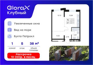 Продается 1-комн. квартира на 5-м этаже в квартале GloraX Клубный. GloraX Клубный - уникальный видовой проект с выделяющейся архитектурой в развитом районе Владивостока. Общая площадь лота составляет 38,97 кв. м, из которых 13,13 кв. м отведено под жилую и 13,84 кв. м под кухонную зону. Номер квартиры - 27.