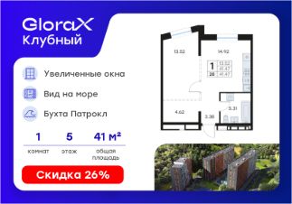 Продается 1-комн. квартира на 5-м этаже в квартале GloraX Клубный. GloraX Клубный - уникальный видовой проект с выделяющейся архитектурой в развитом районе Владивостока. Общая площадь лота составляет 41,47 кв. м, из которых 13,52 кв. м отведено под жилую и 14,92 кв. м под кухонную зону. Номер квартиры - 28.