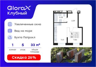 Продается 1-комн. квартира на 5-м этаже в квартале GloraX Клубный. GloraX Клубный - уникальный видовой проект с выделяющейся архитектурой в развитом районе Владивостока. Общая площадь лота составляет 33,14 кв. м, из которых 9,86 кв. м отведено под жилую и 11,61 кв. м под кухонную зону. Номер квартиры - 33.