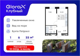 Продается 1-комн. квартира на 6-м этаже в квартале GloraX Клубный. GloraX Клубный - уникальный видовой проект с выделяющейся архитектурой в развитом районе Владивостока. Общая площадь лота составляет 33,95 кв. м, из которых 11,82 кв. м отведено под жилую и 12,34 кв. м под кухонную зону. Номер квартиры - 51.