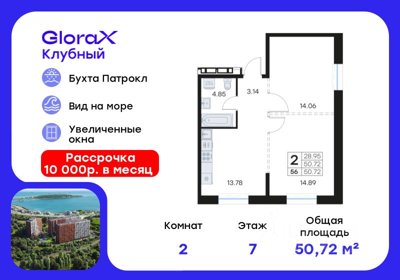 Продается 2-комн. квартира на 7-м этаже в квартале GloraX Клубный. GloraX Клубный - уникальный видовой проект с выделяющейся архитектурой в развитом районе Владивостока. Общая площадь лота составляет 50,72 кв. м, из которых 28,95 кв. м отведено под жилую и 13,78 кв. м под кухонную зону. Номер квартиры - 56.