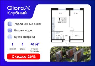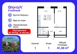 Продается 1-комн. квартира на 1-м этаже в квартале GloraX Клубный. GloraX Клубный - уникальный видовой проект с выделяющейся архитектурой в развитом районе Владивостока. Общая площадь лота составляет 41,55 кв. м, из которых 12,36 кв. м отведено под жилую и 17,51 кв. м под кухонную зону. Номер квартиры - 208.