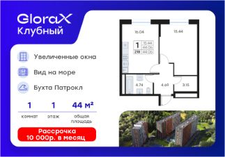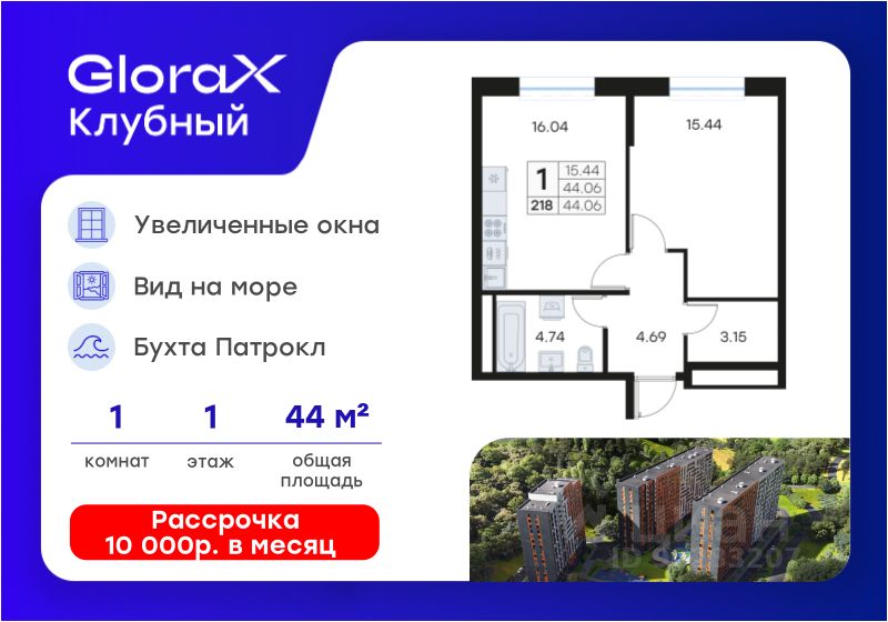 Продается 1-комн. квартира на 1-м этаже в квартале GloraX Клубный. GloraX Клубный - уникальный видовой проект с выделяющейся архитектурой в развитом районе Владивостока. Общая площадь лота составляет 44,06 кв. м, из которых 15,44 кв. м отведено под жилую и 16,04 кв. м под кухонную зону. Номер квартиры - 218.