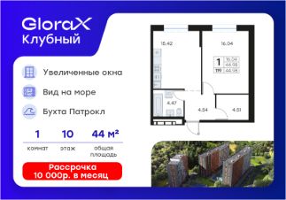 Продается 1-комн. квартира на 10-м этаже в квартале GloraX Клубный. GloraX Клубный - уникальный видовой проект с выделяющейся архитектурой в развитом районе Владивостока. Общая площадь лота составляет 44,98 кв. м, из которых 16,04 кв. м отведено под жилую и 15,42 кв. м под кухонную зону. Номер квартиры - 119.