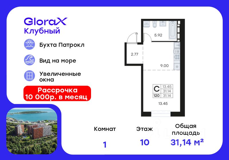 Продается квартира-студия на 10-м этаже в квартале GloraX Клубный. GloraX Клубный - уникальный видовой проект с выделяющейся архитектурой в развитом районе Владивостока. Общая площадь лота составляет 31,14 кв. м, из которых 13,45 кв. м отведено под жилую и 9,00 кв. м под кухонную зону. Номер квартиры - 120.