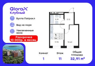 Продается 1-комн. квартира на 11-м этаже в квартале GloraX Клубный. GloraX Клубный - уникальный видовой проект с выделяющейся архитектурой в развитом районе Владивостока. Общая площадь лота составляет 32,91 кв. м, из которых 10,64 кв. м отведено под жилую и 11,95 кв. м под кухонную зону. Номер квартиры - 136. Преимущества квартиры: однокомнатная квартира. Преимущества проекта: • Квартиры с панорамными видами на бухту Патрокл, маяк Басаргина и остров Русский • Планировочные решения под любой жизненный сценарий от 23 до 67 м² • Гардеробные комнаты, увеличенные панорамные окна, просторные кухни-гостиные • Эксклюзивное благоустройство: продуманное зонирование, игровые и спортивные площадки, площадка для стритбола, амфитеатр • Премиальный дизайн входных групп с лаунж-зоной • Безбарьерная среда, закрытая территория, видеонаблюдение • Лапомойки, колясочные и туалеты на первом этаже • Двухуровневый подземный паркинг на 350 машино-мест с лифтом на жилые этажи • Келлеры на цокольном этаже для хранения сезонных вещей с доступом на лифте • Современный ландшафтный дизайн комплекса от DEREVOPARK GloraX Клубный заповедник в черте мегаполиса. Комплекс тщательно продуман для максимального удобства и обеспечения безопасности его жителей. Квартал расположен в одном из самых современных развивающихся районов города: совсем рядом раскинулась живописная бухта Патрокл, где можно прогуляться по облагороженной пешеходной набережной, заглянуть на пляж или в школу серфинга. Комплекс имеет прекрасную транспортную доступность: рядом проходит объездная трасса СеданкаПатрокл, а до центар можно доехать всего за 15 минут. Проект включает 3 монолитных корпуса, каждый из которых спроектирован с акцентом на комфорт, безопасность и современный образ жизни рядом с уникальной природой. Общий двор создает приватную территорию для житей комплекса. В комплексе предусмотрен двухуровневый подземный паркинг на 350 машино-мест с доступом прямо с жилых этажей. Паркинг оборудован современными системами видеонаблюдения, контроля въезда-выезда и пожаротушения. На цокольном этаже размещаются келлеры для хранения сезонных и габаритных вещей. Доступ к кладовым на лифте с жилых этажей. Современный ландшафтный дизайн жилого комплекса GloraX Клубный создан ведущей российской студией DEREVOPARK. Во дворе для детей всех возрастов предусмотрены различные игровые площадки с лазалками, батутами, качелями и песочницей. В центре расположен специальный "зеленый остров", где взрослые могут отдохнуть на качелях и гамаках в тени больших деревьев. Для любителей спорта предусмотрены две специальные спортивные площадки для настольного тенниса и стритбола — для зрителей тоже найдется место! А еще на территории комплекса будет дорожка для роллеров и любителей покататься на велосипеде, самокате или скейте. В шаговой доступности располагаются все необходимые объекты социальной и коммерческой инфраструктуры. Цена указана при 100% оплате или