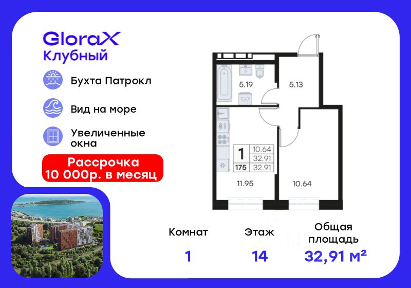 Продается 1-комн. квартира на 14-м этаже в квартале GloraX Клубный. GloraX Клубный - уникальный видовой проект с выделяющейся архитектурой в развитом районе Владивостока. Общая площадь лота составляет 32,91 кв. м, из которых 10,64 кв. м отведено под жилую и 11,95 кв. м под кухонную зону. Номер квартиры - 175.