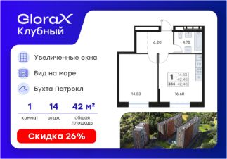 Продается 1-комн. квартира на 14-м этаже в квартале GloraX Клубный. GloraX Клубный - уникальный видовой проект с выделяющейся архитектурой в развитом районе Владивостока. Общая площадь лота составляет 42,43 кв. м, из которых 14,83 кв. м отведено под жилую и 16,68 кв. м под кухонную зону. Номер квартиры - 384.