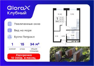 Продается 1-комн. квартира на 15-м этаже в квартале GloraX Клубный. GloraX Клубный - уникальный видовой проект с выделяющейся архитектурой в развитом районе Владивостока. Общая площадь лота составляет 34,90 кв. м, из которых 10,42 кв. м отведено под жилую и 11,95 кв. м под кухонную зону. Номер квартиры - 390.