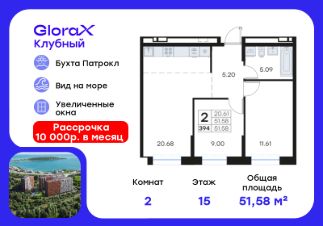 Продается 2-комн. квартира на 15-м этаже в квартале GloraX Клубный. GloraX Клубный - уникальный видовой проект с выделяющейся архитектурой в развитом районе Владивостока. Общая площадь лота составляет 51,58 кв. м, из которых 20,61 кв. м отведено под жилую и 20,68 кв. м под кухонную зону. Номер квартиры - 394.