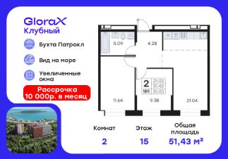 Продается 2-комн. квартира на 15-м этаже в квартале GloraX Клубный. GloraX Клубный - уникальный видовой проект с выделяющейся архитектурой в развитом районе Владивостока. Общая площадь лота составляет 51,43 кв. м, из которых 21,02 кв. м отведено под жилую и 21,04 кв. м под кухонную зону. Номер квартиры - 189.