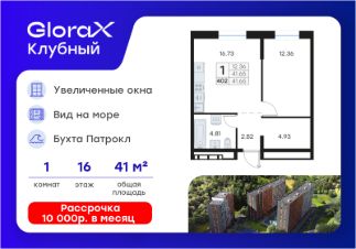 Продается 1-комн. квартира на 16-м этаже в квартале GloraX Клубный. GloraX Клубный - уникальный видовой проект с выделяющейся архитектурой в развитом районе Владивостока. Общая площадь лота составляет 41,65 кв. м, из которых 12,36 кв. м отведено под жилую и 16,73 кв. м под кухонную зону. Номер квартиры - 402.