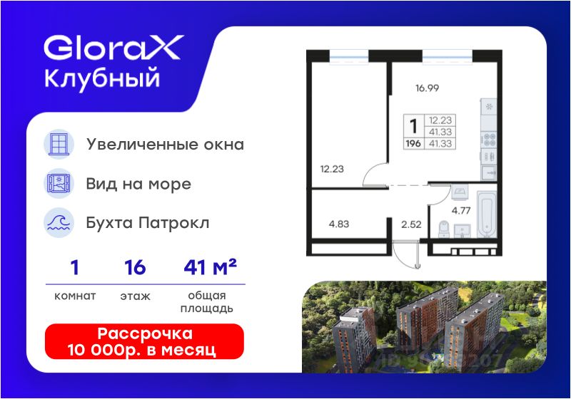 Продается 1-комн. квартира на 16-м этаже в квартале GloraX Клубный. GloraX Клубный - уникальный видовой проект с выделяющейся архитектурой в развитом районе Владивостока. Общая площадь лота составляет 41,33 кв. м, из которых 12,23 кв. м отведено под жилую и 16,99 кв. м под кухонную зону. Номер квартиры - 196.