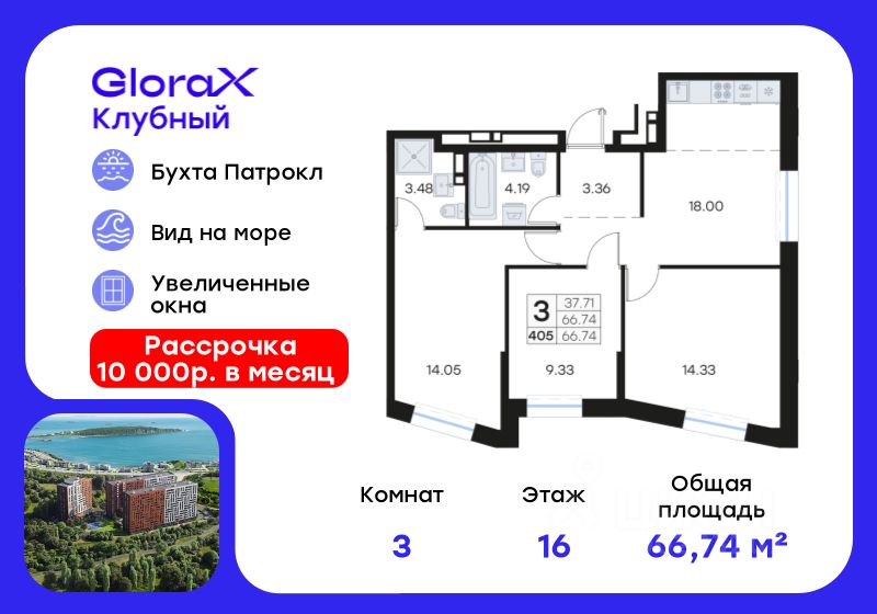 Продается 3-комн. квартира на 16-м этаже в квартале GloraX Клубный. GloraX Клубный - уникальный видовой проект с выделяющейся архитектурой в развитом районе Владивостока. Общая площадь лота составляет 66,74 кв. м, из которых 37,71 кв. м отведено под жилую и 18,00 кв. м под кухонную зону. Номер квартиры - 405. Преимущества квартиры: просторная квартира с 3 спальнями и кухней-гостиной; высокий этаж; угловая; мастер-спальня. Преимущества проекта: • Квартиры с панорамными видами на бухту Патрокл, маяк Басаргина и остров Русский • Планировочные решения под любой жизненный сценарий от 23 до 67 м² • Гардеробные комнаты, увеличенные панорамные окна, просторные кухни-гостиные • Эксклюзивное благоустройство: продуманное зонирование, игровые и спортивные площадки, площадка для стритбола, амфитеатр • Премиальный дизайн входных групп с лаунж-зоной • Безбарьерная среда, закрытая территория, видеонаблюдение • Лапомойки, колясочные и туалеты на первом этаже • Двухуровневый подземный паркинг на 350 машино-мест с лифтом на жилые этажи • Келлеры на цокольном этаже для хранения сезонных вещей с доступом на лифте • Современный ландшафтный дизайн комплекса от DEREVOPARK GloraX Клубный заповедник в черте мегаполиса. Комплекс тщательно продуман для максимального удобства и обеспечения безопасности его жителей. Квартал расположен в одном из самых современных развивающихся районов города: совсем рядом раскинулась живописная бухта Патрокл, где можно прогуляться по облагороженной пешеходной набережной, заглянуть на пляж или в школу серфинга. Комплекс имеет прекрасную транспортную доступность: рядом проходит объездная трасса СеданкаПатрокл, а до центар можно доехать всего за 15 минут. Проект включает 3 монолитных корпуса, каждый из которых спроектирован с акцентом на комфорт, безопасность и современный образ жизни рядом с уникальной природой. Общий двор создает приватную территорию для житей комплекса. В комплексе предусмотрен двухуровневый подземный паркинг на 350 машино-мест с доступом прямо с жилых этажей. Паркинг оборудован современными системами видеонаблюдения, контроля въезда-выезда и пожаротушения. На цокольном этаже размещаются келлеры для хранения сезонных и габаритных вещей. Доступ к кладовым на лифте с жилых этажей. Современный ландшафтный дизайн жилого комплекса GloraX Клубный создан ведущей российской студией DEREVOPARK. Во дворе для детей всех возрастов предусмотрены различные игровые площадки с лазалками, батутами, качелями и песочницей. В центре расположен специальный "зеленый остров", где взрослые могут отдохнуть на качелях и гамаках в тени больших деревьев. Для любителей спорта предусмотрены две специальные спортивные площадки для настольного тенниса и стритбола — для зрителей тоже найдется место! А еще на территории комплекса будет дорожка для роллеров и любителей покататься на велосипеде, самокате или скейте. В шаговой доступности располагаются все необходимые объекты социальн