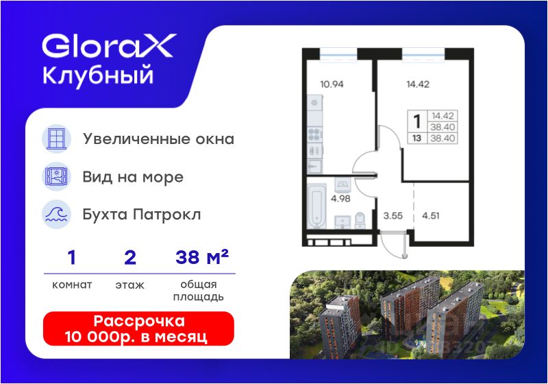 Продается 1-комн. квартира на 2-м этаже в квартале GloraX Клубный. GloraX Клубный - уникальный видовой проект с выделяющейся архитектурой в развитом районе Владивостока. Общая площадь лота составляет 38,40 кв. м, из которых 14,42 кв. м отведено под жилую и 10,94 кв. м под кухонную зону. Номер квартиры - 13.