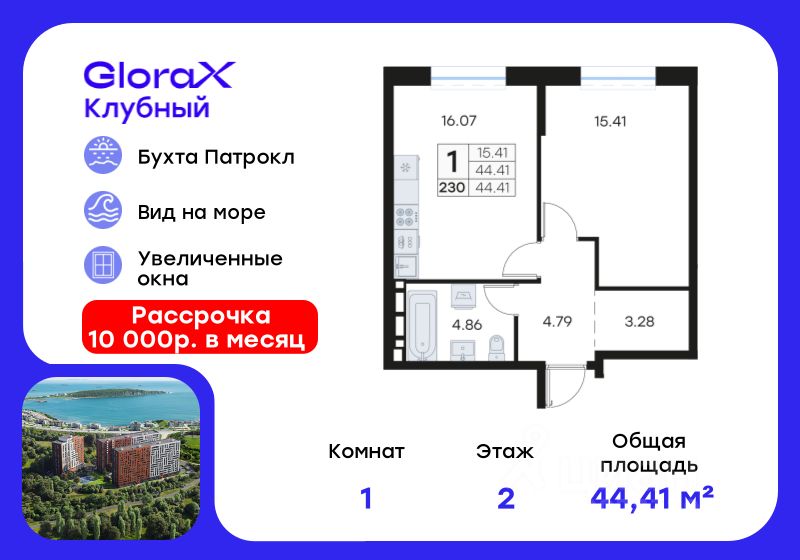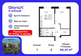 Продается 1-комн. квартира на 2-м этаже в квартале GloraX Клубный. GloraX Клубный - уникальный видовой проект с выделяющейся архитектурой в развитом районе Владивостока. Общая площадь лота составляет 44,41 кв. м, из которых 15,41 кв. м отведено под жилую и 16,07 кв. м под кухонную зону. Номер квартиры - 230.
