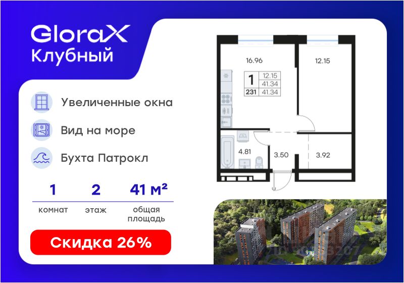 Продается 1-комн. квартира на 2-м этаже в квартале GloraX Клубный. GloraX Клубный - уникальный видовой проект с выделяющейся архитектурой в развитом районе Владивостока. Общая площадь лота составляет 41,34 кв. м, из которых 12,15 кв. м отведено под жилую и 16,96 кв. м под кухонную зону. Номер квартиры - 231. Преимущества квартиры: евро-двухкомнатная квартира; гардеробная. Преимущества проекта: • Квартиры с панорамными видами на бухту Патрокл, маяк Басаргина и остров Русский • Планировочные решения под любой жизненный сценарий от 23 до 67 м² • Гардеробные комнаты, увеличенные панорамные окна, просторные кухни-гостиные • Эксклюзивное благоустройство: продуманное зонирование, игровые и спортивные площадки, площадка для стритбола, амфитеатр • Премиальный дизайн входных групп с лаунж-зоной • Безбарьерная среда, закрытая территория, видеонаблюдение • Лапомойки, колясочные и туалеты на первом этаже • Двухуровневый подземный паркинг на 350 машино-мест с лифтом на жилые этажи • Келлеры на цокольном этаже для хранения сезонных вещей с доступом на лифте • Современный ландшафтный дизайн комплекса от DEREVOPARK GloraX Клубный заповедник в черте мегаполиса. Комплекс тщательно продуман для максимального удобства и обеспечения безопасности его жителей. Квартал расположен в одном из самых современных развивающихся районов города: совсем рядом раскинулась живописная бухта Патрокл, где можно прогуляться по облагороженной пешеходной набережной, заглянуть на пляж или в школу серфинга. Комплекс имеет прекрасную транспортную доступность: рядом проходит объездная трасса СеданкаПатрокл, а до центар можно доехать всего за 15 минут. Проект включает 3 монолитных корпуса, каждый из которых спроектирован с акцентом на комфорт, безопасность и современный образ жизни рядом с уникальной природой. Общий двор создает приватную территорию для житей комплекса. В комплексе предусмотрен двухуровневый подземный паркинг на 350 машино-мест с доступом прямо с жилых этажей. Паркинг оборудован современными системами видеонаблюдения, контроля въезда-выезда и пожаротушения. На цокольном этаже размещаются келлеры для хранения сезонных и габаритных вещей. Доступ к кладовым на лифте с жилых этажей. Современный ландшафтный дизайн жилого комплекса GloraX Клубный создан ведущей российской студией DEREVOPARK. Во дворе для детей всех возрастов предусмотрены различные игровые площадки с лазалками, батутами, качелями и песочницей. В центре расположен специальный "зеленый остров", где взрослые могут отдохнуть на качелях и гамаках в тени больших деревьев. Для любителей спорта предусмотрены две специальные спортивные площадки для настольного тенниса и стритбола — для зрителей тоже найдется место! А еще на территории комплекса будет дорожка для роллеров и любителей покататься на велосипеде, самокате или скейте. В шаговой доступности располагаются все необходимые объекты социальной и коммерческой инфраструктуры. Цена указана при