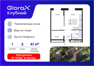 Продается 1-комн. квартира на 2-м этаже в квартале GloraX Клубный. GloraX Клубный - уникальный видовой проект с выделяющейся архитектурой в развитом районе Владивостока. Общая площадь лота составляет 41,69 кв. м, из которых 12,09 кв. м отведено под жилую и 16,51 кв. м под кухонную зону. Номер квартиры - 25.