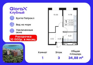 Продается 1-комн. квартира на 3-м этаже в квартале GloraX Клубный. GloraX Клубный - уникальный видовой проект с выделяющейся архитектурой в развитом районе Владивостока. Общая площадь лота составляет 34,88 кв. м, из которых 10,55 кв. м отведено под жилую и 11,75 кв. м под кухонную зону. Номер квартиры - 37.