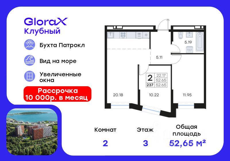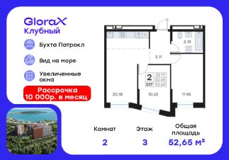 Продается 2-комн. квартира на 3-м этаже в квартале GloraX Клубный. GloraX Клубный - уникальный видовой проект с выделяющейся архитектурой в развитом районе Владивостока. Общая площадь лота составляет 52,65 кв. м, из которых 22,17 кв. м отведено под жилую и 20,18 кв. м под кухонную зону. Номер квартиры - 237.
