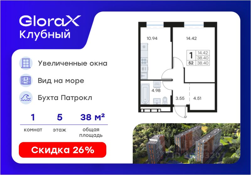 Продается 1-комн. квартира на 5-м этаже в квартале GloraX Клубный. GloraX Клубный - уникальный видовой проект с выделяющейся архитектурой в развитом районе Владивостока. Общая площадь лота составляет 38,40 кв. м, из которых 14,42 кв. м отведено под жилую и 10,94 кв. м под кухонную зону. Номер квартиры - 52.
