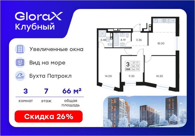 Продается 3-комн. квартира на 7-м этаже в квартале GloraX Клубный. GloraX Клубный - уникальный видовой проект с выделяющейся архитектурой в развитом районе Владивостока. Общая площадь лота составляет 66,74 кв. м, из которых 37,71 кв. м отведено под жилую и 18,00 кв. м под кухонную зону. Номер квартиры - 288.