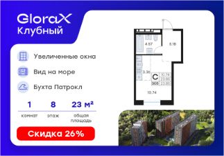 Продается квартира-студия на 8-м этаже в квартале GloraX Клубный. GloraX Клубный - уникальный видовой проект с выделяющейся архитектурой в развитом районе Владивостока. Общая площадь лота составляет 23,85 кв. м, из которых 10,74 кв. м отведено под жилую и 3,36 кв. м под кухонную зону. Номер квартиры - 305.