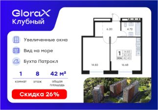 Продается 1-комн. квартира на 8-м этаже в квартале GloraX Клубный. GloraX Клубный - уникальный видовой проект с выделяющейся архитектурой в развитом районе Владивостока. Общая площадь лота составляет 42,43 кв. м, из которых 14,83 кв. м отведено под жилую и 16,68 кв. м под кухонную зону. Номер квартиры - 306.