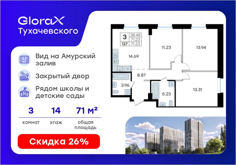 Продается 3-комн. квартира на 14-м этаже в жилом комплексе GloraX Тухачевского — современном проекте нового формата в престижном районе Владивостока. Общая площадь лота составляет 71,23 кв. м, из которых 38,48 кв. м отведено под жилую и 14,69 кв. м под кухонную зону. Номер квартиры - 127.