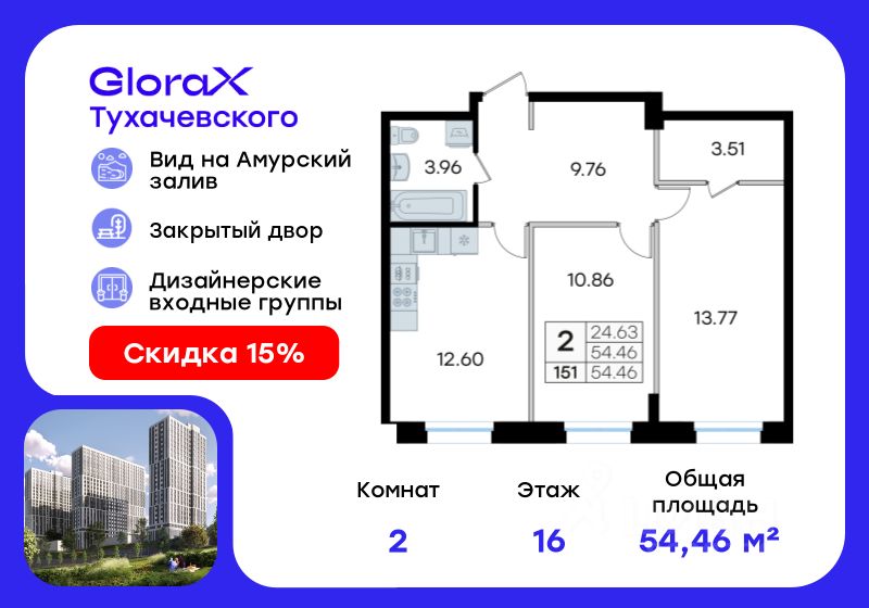 Продается 2-комн. квартира на 16-м этаже в жилом комплексе GloraX Тухачевского — современном проекте нового формата в престижном районе Владивостока. Общая площадь лота составляет 54,46 кв. м, из которых 24,63 кв. м отведено под жилую и 12,60 кв. м под кухонную зону. Номер квартиры - 151.