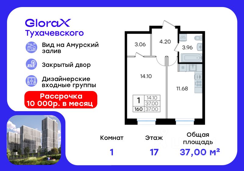 Продается 1-комн. квартира на 17-м этаже в жилом комплексе GloraX Тухачевского — современном проекте нового формата в престижном районе Владивостока. Общая площадь лота составляет 37,00 кв. м, из которых 14,10 кв. м отведено под жилую и 11,68 кв. м под кухонную зону. Номер квартиры - 160.
