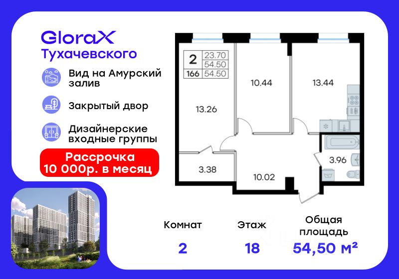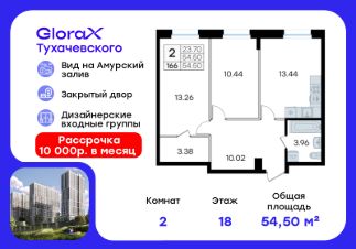 Продается 2-комн. квартира  на 18-м этаже в жилом комплексе GloraX Тухачевского — современном проекте нового формата в престижном районе Владивостока. Общая площадь лота составляет 54,50 кв. м, из которых 23,70 кв. м отведено под жилую и 13,44 кв. м под кухонную зону. Номер квартиры - 166.
