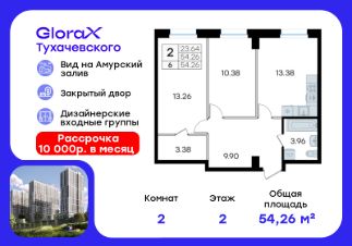 Продается 2-комн. квартира на 2-м этаже в жилом комплексе GloraX Тухачевского — современном проекте нового формата в престижном районе Владивостока. Общая площадь лота составляет 54,26 кв. м, из которых 23,64 кв. м отведено под жилую и 13,38 кв. м под кухонную зону. Номер квартиры - 6.