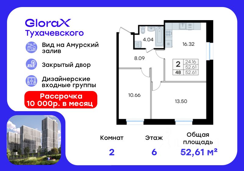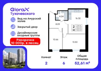Продается 2-комн. квартира на 6-м этаже в жилом комплексе GloraX Тухачевского — современном проекте нового формата в престижном районе Владивостока. Общая площадь лота составляет 52,61 кв. м, из которых 24,16 кв. м отведено под жилую и 16,32 кв. м под кухонную зону. Номер квартиры - 48.