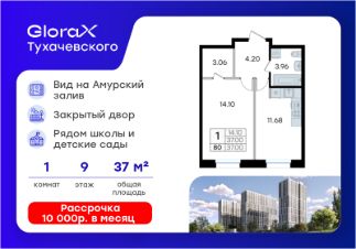 Продается 1-комн. квартира на 9-м этаже в жилом комплексе GloraX Тухачевского — современном проекте нового формата в престижном районе Владивостока. Общая площадь лота составляет 37,00 кв. м, из которых 14,10 кв. м отведено под жилую и 11,68 кв. м под кухонную зону. Номер квартиры - 80.
