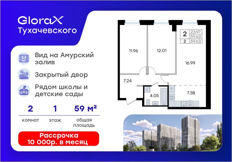 Продается 2-комн. квартира на 1-м этаже в жилом комплексе GloraX Тухачевского — современном проекте нового формата в престижном районе Владивостока. Общая площадь лота составляет 59,63 кв. м, из которых 23,97 кв. м отведено под жилую и 7,38 кв. м под кухонную зону. Номер квартиры - 2.