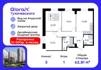 Продается 3-комн. квартира на 1-м этаже в жилом комплексе GloraX Тухачевского — современном проекте нового формата в престижном районе Владивостока. Общая площадь лота составляет 62,81 кв. м, из которых 33,17 кв. м отведено под жилую и 13,84 кв. м под кухонную зону. Номер квартиры - 7.