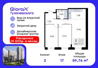 Продается 2-комн. квартира на 17-м этаже в жилом комплексе GloraX Тухачевского — современном проекте нового формата в престижном районе Владивостока. Общая площадь лота составляет 59,76 кв. м, из которых 23,63 кв. м отведено под жилую и 7,38 кв. м под кухонную зону. Номер квартиры - 134.