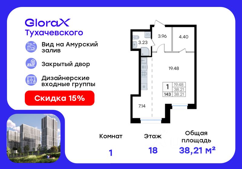 Продается квартира-студия на 18-м этаже в жилом комплексе GloraX Тухачевского — современном проекте нового формата в престижном районе Владивостока. Общая площадь лота составляет 38,21 кв. м, из которых 19,48 кв. м отведено под жилую и 7,14 кв. м под кухонную зону. Номер квартиры - 143.