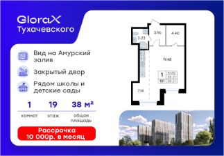 Продается квартира-студия на 19-м этаже в жилом комплексе GloraX Тухачевского — современном проекте нового формата в престижном районе Владивостока. Общая площадь лота составляет 38,21 кв. м, из которых 19,48 кв. м отведено под жилую и 7,14 кв. м под кухонную зону. Номер квартиры - 151.