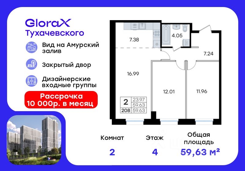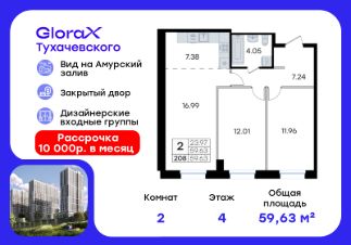 Продается 2-комн. квартира на 4-м этаже в жилом комплексе GloraX Тухачевского — современном проекте нового формата в престижном районе Владивостока. Общая площадь лота составляет 59,63 кв. м, из которых 23,97 кв. м отведено под жилую и 7,38 кв. м под кухонную зону. Номер квартиры - 208.