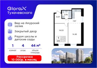 Продается 1-комн. квартира на 4-м этаже в жилом комплексе GloraX Тухачевского — современном проекте нового формата в престижном районе Владивостока. Общая площадь лота составляет 44,49 кв. м, из которых 14,03 кв. м отведено под жилую и 7,57 кв. м под кухонную зону. Номер квартиры - 213.