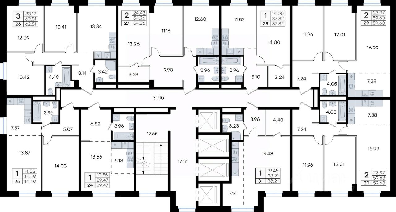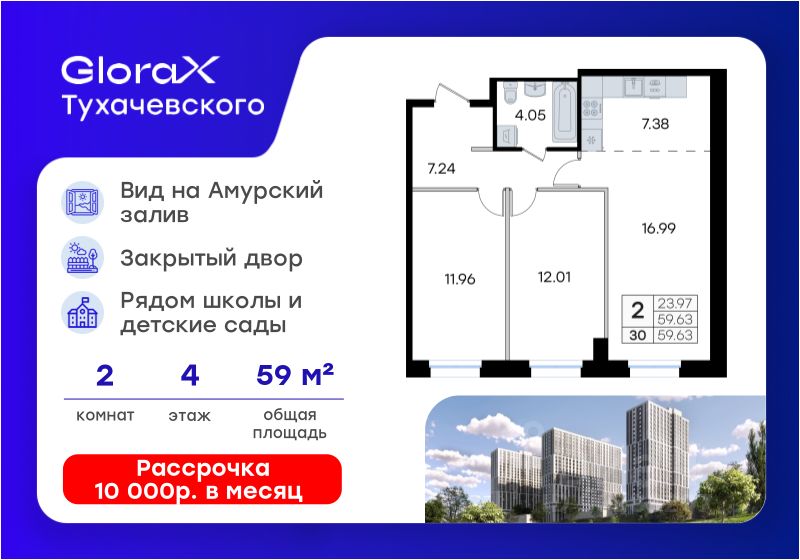 Продается 2-комн. квартира на 4-м этаже в жилом комплексе GloraX Тухачевского — современном проекте нового формата в престижном районе Владивостока. Общая площадь лота составляет 59,63 кв. м, из которых 23,97 кв. м отведено под жилую и 7,38 кв. м под кухонную зону. Номер квартиры - 30.