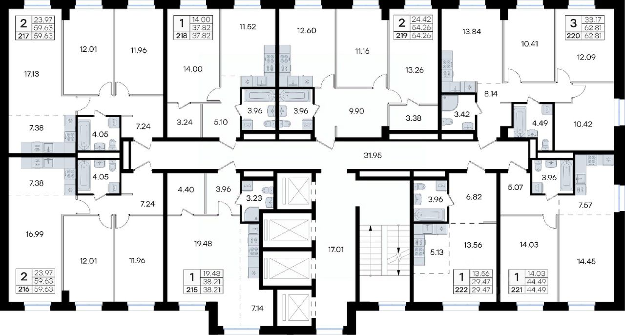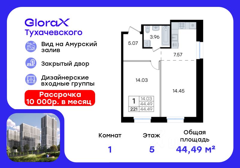Продается 1-комн. квартира на 5-м этаже в жилом комплексе GloraX Тухачевского — современном проекте нового формата в престижном районе Владивостока. Общая площадь лота составляет 44,49 кв. м, из которых 14,03 кв. м отведено под жилую и 7,57 кв. м под кухонную зону. Номер квартиры - 221.