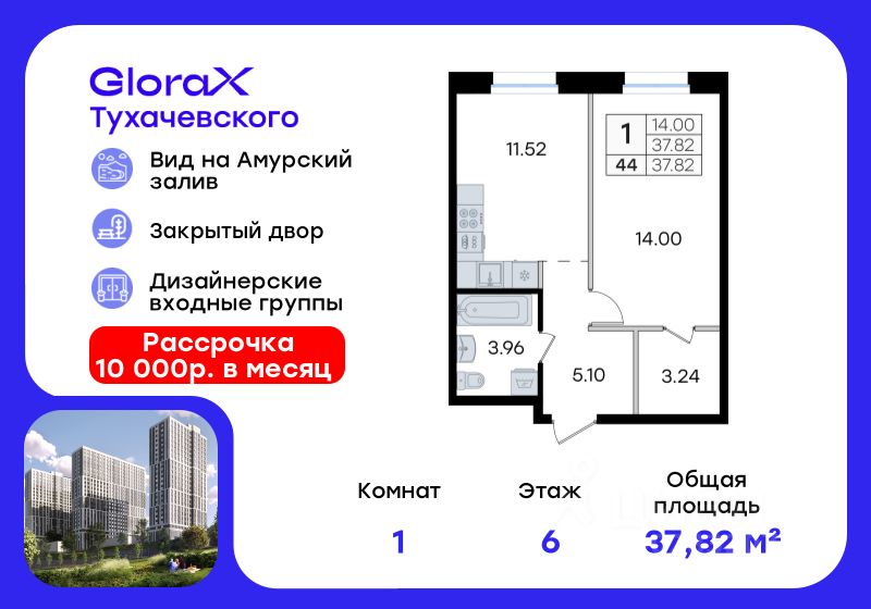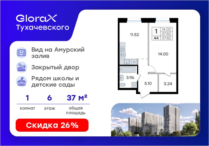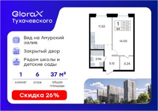 Продается 1-комн. квартира на 6-м этаже в жилом комплексе GloraX Тухачевского — современном проекте нового формата в престижном районе Владивостока. Общая площадь лота составляет 37,82 кв. м, из которых 14,00 кв. м отведено под жилую и 11,52 кв. м под кухонную зону. Номер квартиры - 44.