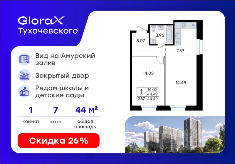 Продается 1-комн. квартира на 7-м этаже в жилом комплексе GloraX Тухачевского — современном проекте нового формата в престижном районе Владивостока. Общая площадь лота составляет 44,49 кв. м, из которых 14,03 кв. м отведено под жилую и 7,57 кв. м под кухонную зону. Номер квартиры - 237.