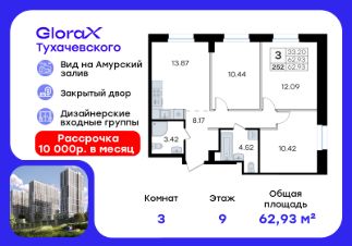 Продается 3-комн. квартира на 9-м этаже в жилом комплексе GloraX Тухачевского — современном проекте нового формата в престижном районе Владивостока. Общая площадь лота составляет 62,93 кв. м, из которых 33,20 кв. м отведено под жилую и 13,87 кв. м под кухонную зону. Номер квартиры - 252.