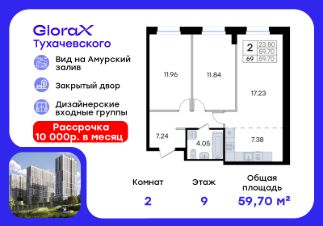 Продается 2-комн. квартира на 9-м этаже в жилом комплексе GloraX Тухачевского — современном проекте нового формата в престижном районе Владивостока. Общая площадь лота составляет 59,70 кв. м, из которых 23,80 кв. м отведено под жилую и 7,38 кв. м под кухонную зону. Номер квартиры - 69.