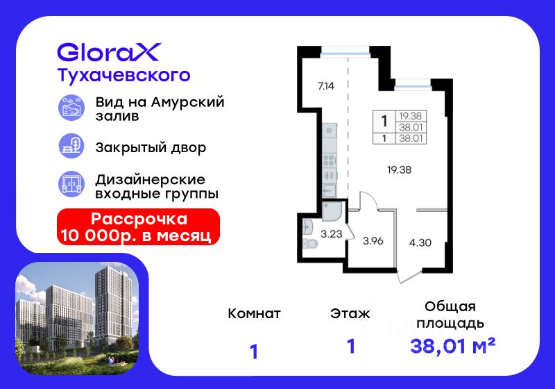 Продается квартира-студия на 1-м этаже в жилом комплексе GloraX Тухачевского — современном проекте нового формата в престижном районе Владивостока. Общая площадь лота составляет 38,01 кв. м, из которых 19,38 кв. м отведено под жилую и 7,14 кв. м под кухонную зону. Номер квартиры - 1.