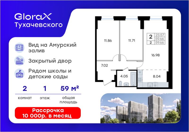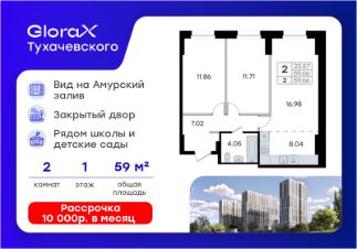 Продается 2-комн. квартира на 1-м этаже в жилом комплексе GloraX Тухачевского — современном проекте нового формата в престижном районе Владивостока. Общая площадь лота составляет 59,66 кв. м, из которых 23,57 кв. м отведено под жилую и 8,04 кв. м под кухонную зону. Номер квартиры - 2.